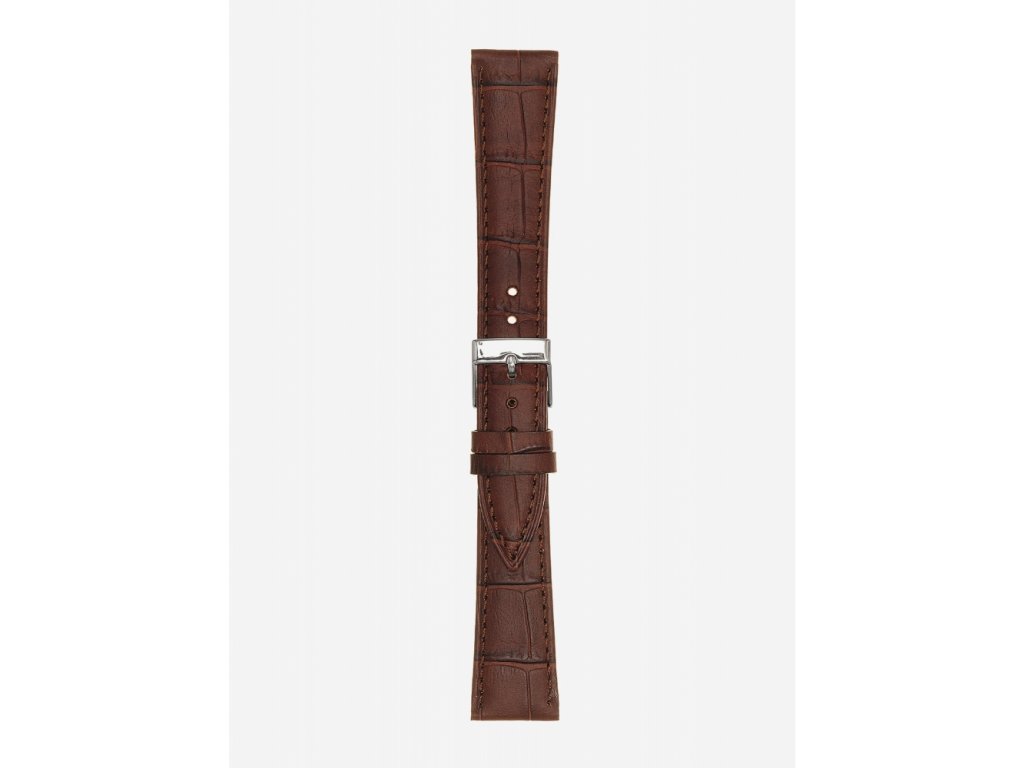 Elegantný matný skrátený remienok je vyrobený z talianskej hovädzej kože. Povrchová úprava s potlačeným vzorom aligátora vyzerá štýlovo. Podšívka je tiež kožená, preto na ruke pôsobí príjemným dojmom. Po bokoch je prešitý a mierne vypolstrovaný. Dĺžka jednotlivých častí remienka je 102 mm a 75 mm. Pracka z nerezovej ocele je krásne lesklá a okrem dobrého výzoru má prednosti v tom, že je nehrdzavejúca a antialergická.